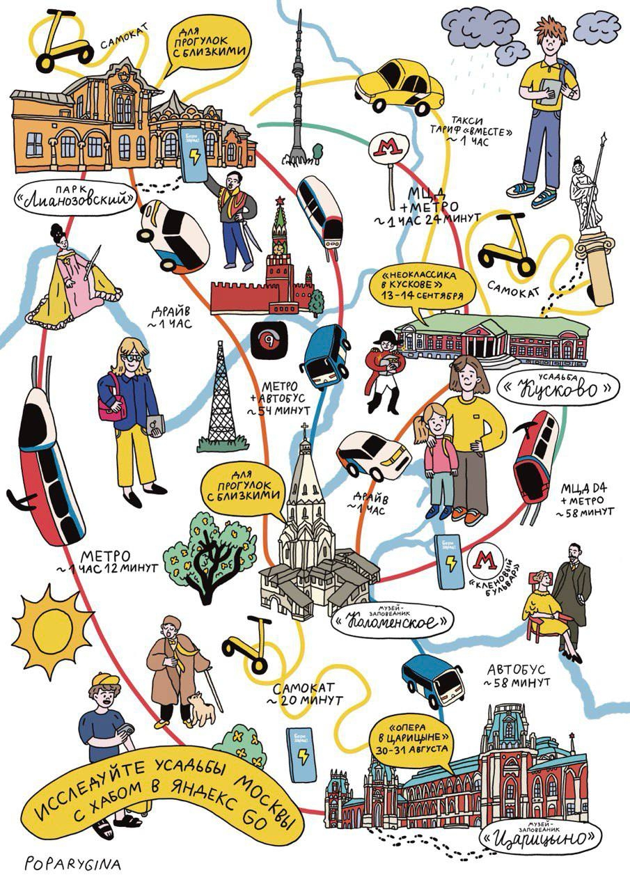 Яндекс Go и фестиваль «Усадьбы Москвы» выпустили карту маршрутов по четырем усадебным паркам Москвы и рассказали историю каждого. Иллюстрации создала художница Полина Парыгина, известная по работам для H&M, фонда «Вера», Яна Топлеса, а маршруты между усадьбами подобраны в разделе Хаб в Яндекс Go.