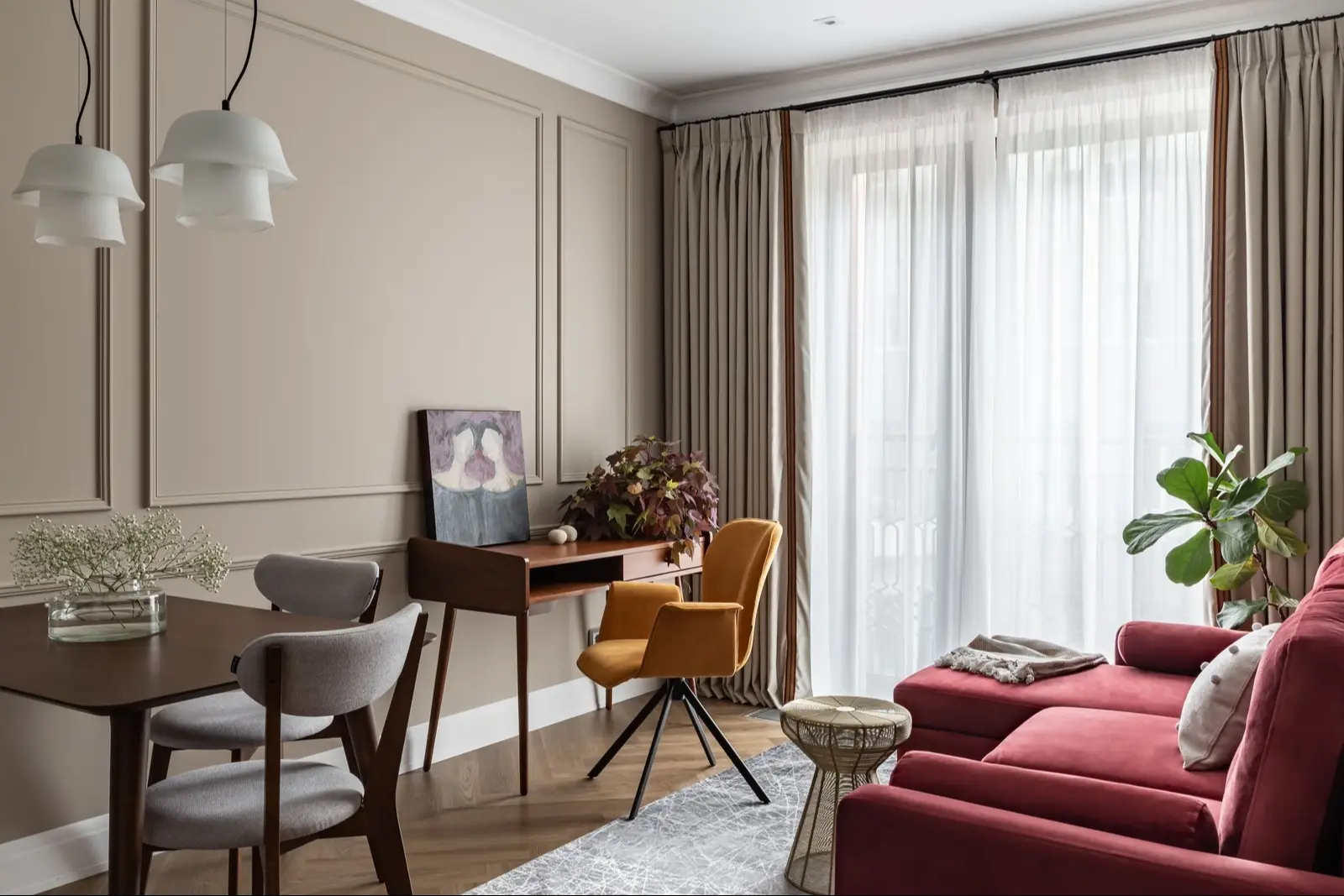 Кварцпаркет без труда сочетается с любым стилем - с классикой или сканди. Он идеально подходит для того, чтобы подчеркнуть мягкую мебель. А еще с натуральным деревянным полом превосходно смотрится цветное стекло. Получается и уютно, и стильно.