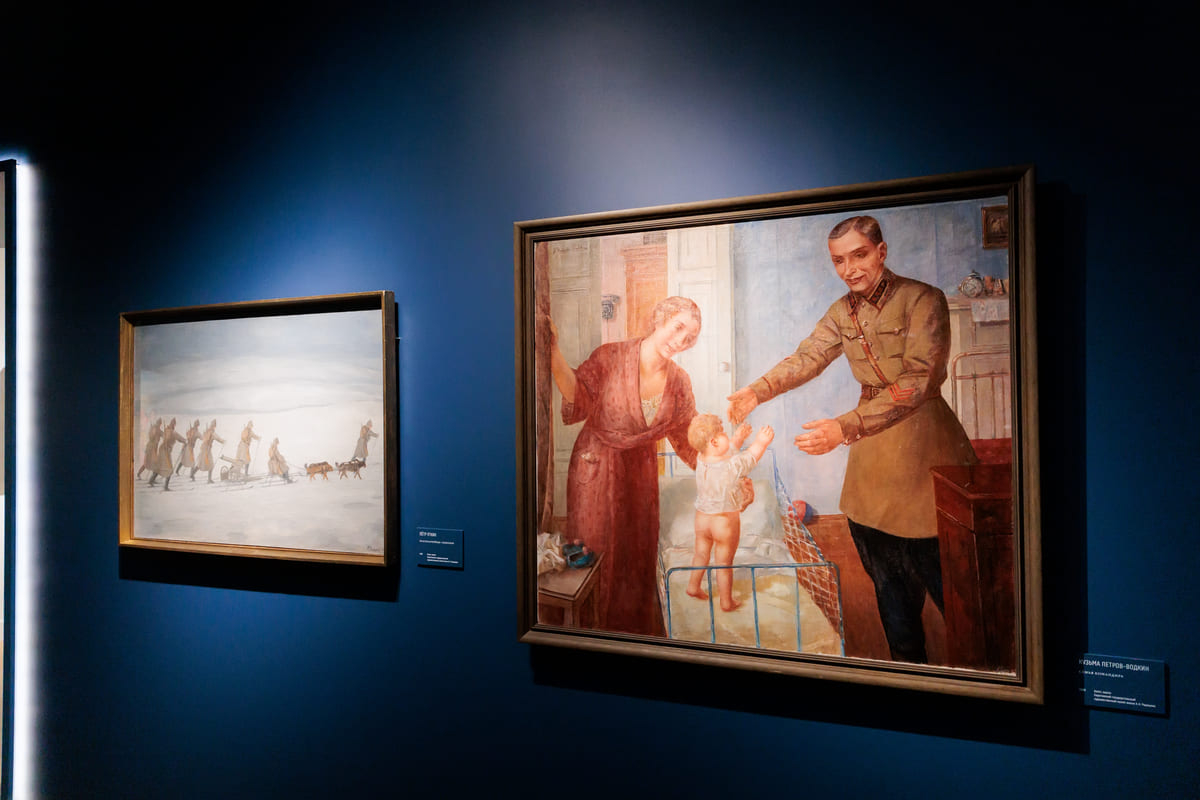 Кстати, ценители Петрова-Водкина смогут увидеть на выставке некоторые из его характерных полотен — например, «Семью командира» из Хвалынского филиала Саратовского музея им. Радищева, или изображение Ленина в гробу, где вождь революции кажется спящим, вечно живым.