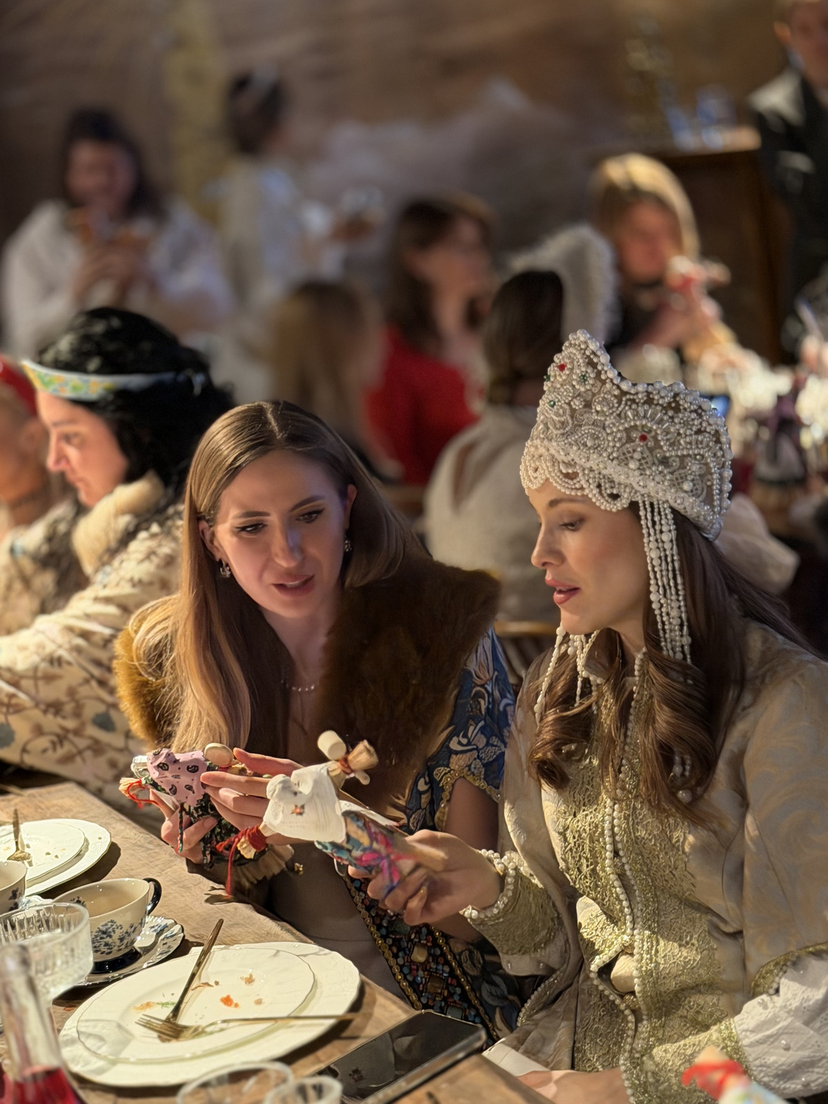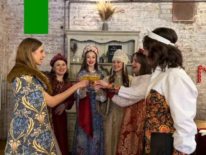 Гостьи в роскошных боярских нарядах заполнили залы усадьбы с трехсотлетней историей. Дресс-код здесь был не просто правилом, а мостом между веками. «Скрепка» уже примеряла дворянский этикет в фамильном особняке XIX века, но Масленица — история особая.