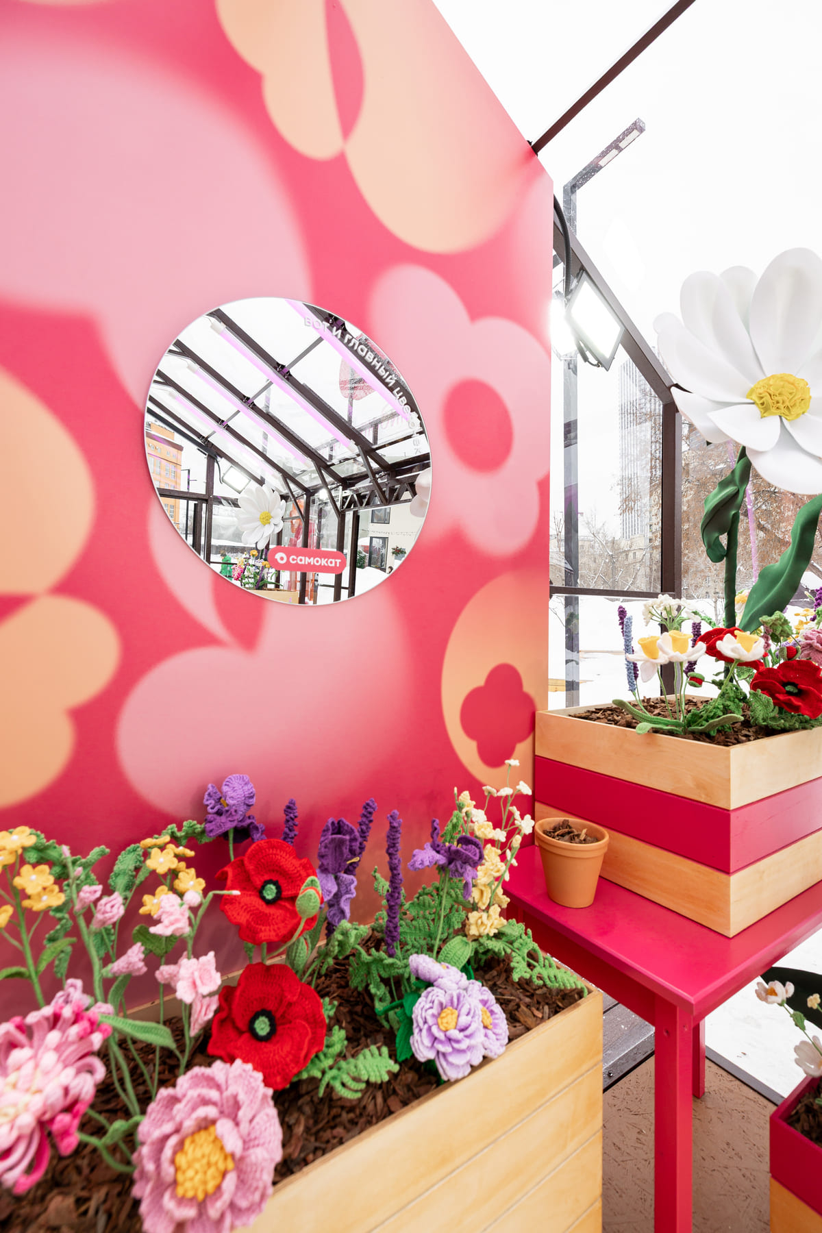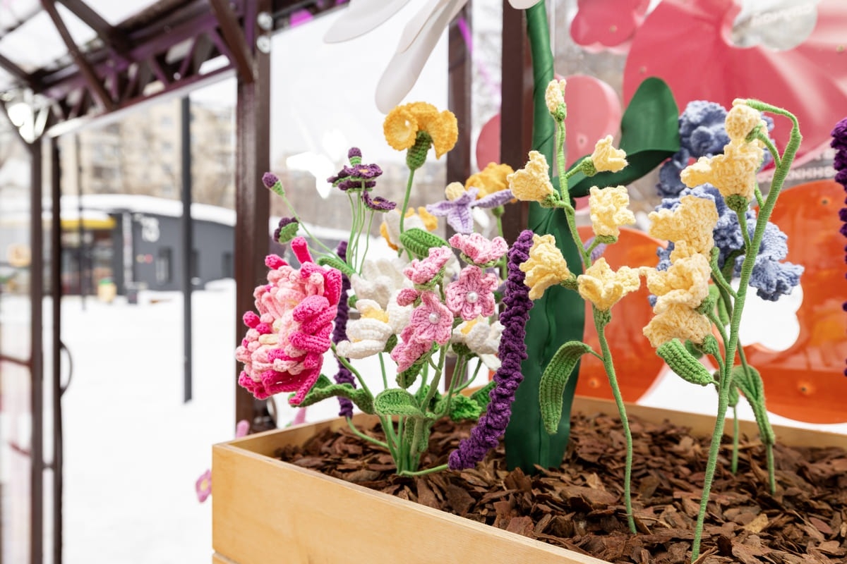 Самокат открыл в Москве теплицу с вязаными цветами — арт-объект о ранней весне