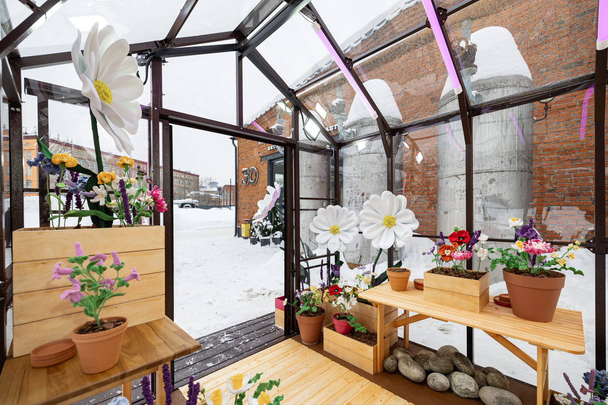 В Москве появился новый сезонный арт-объект: онлайн-ритейлер Самокат установил на территории «Хлебозавода № 9» теплицу с вязаными цветами. Проект стал частью городской кампании, посвящённой ощущению ранней весны и небольшим повседневным жестам заботы.