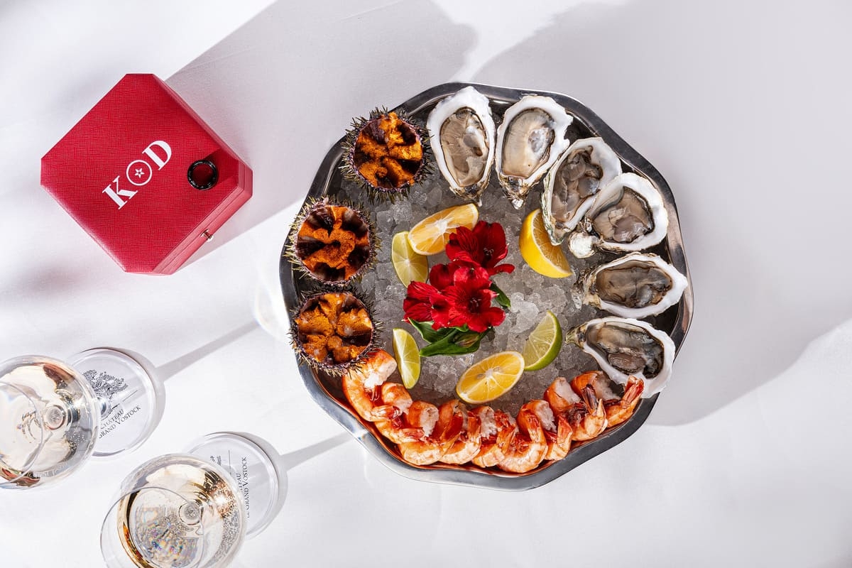 В сет входит: 6 устриц, 3 ежа, большие фирменные креветки и угощение каждому гостю от Château le Grand Vostock в рамках коллаборации.