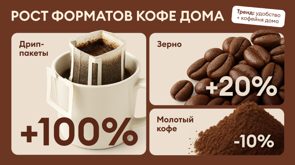 - Молотый кофе: снижение на 10% — всё ещё в корзинах покупателей, но уступает другим форматам.