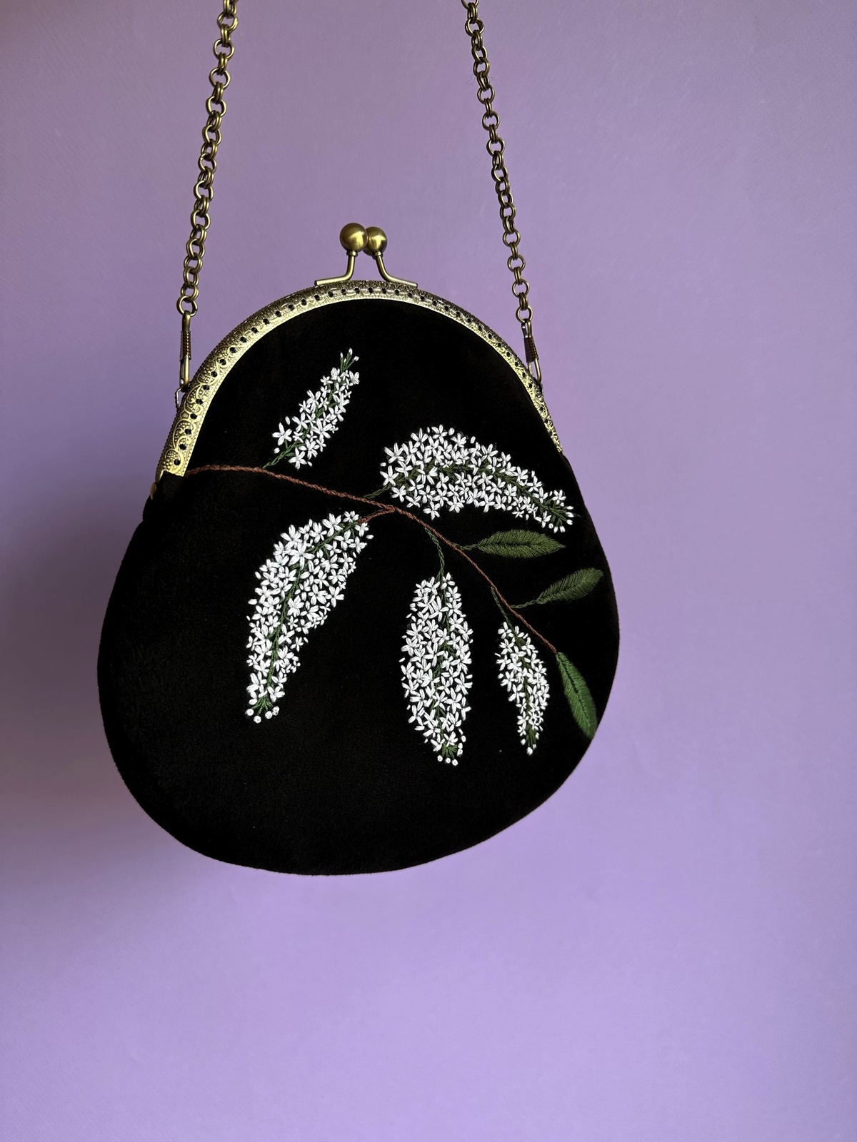 Да, есть. Это чёрная бархатная сумочка с веточкой черёмухи. Я вышивала её с большим удовольствием и улыбкой на лице.