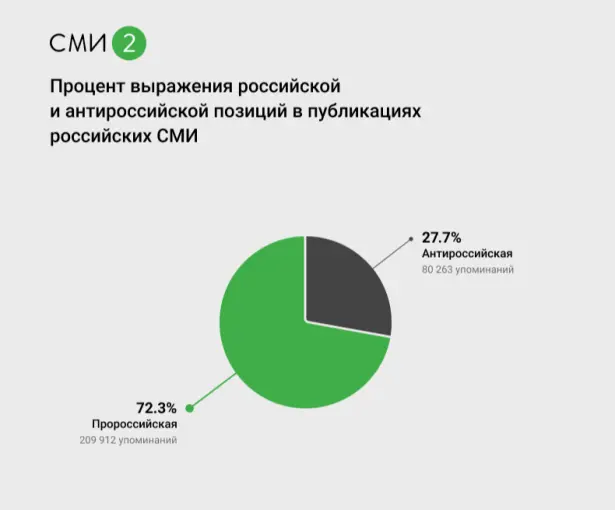 Что касается пророссийской позиции, она прослеживается в 72,3% публикаций российских СМИ (209 912 упоминаний).