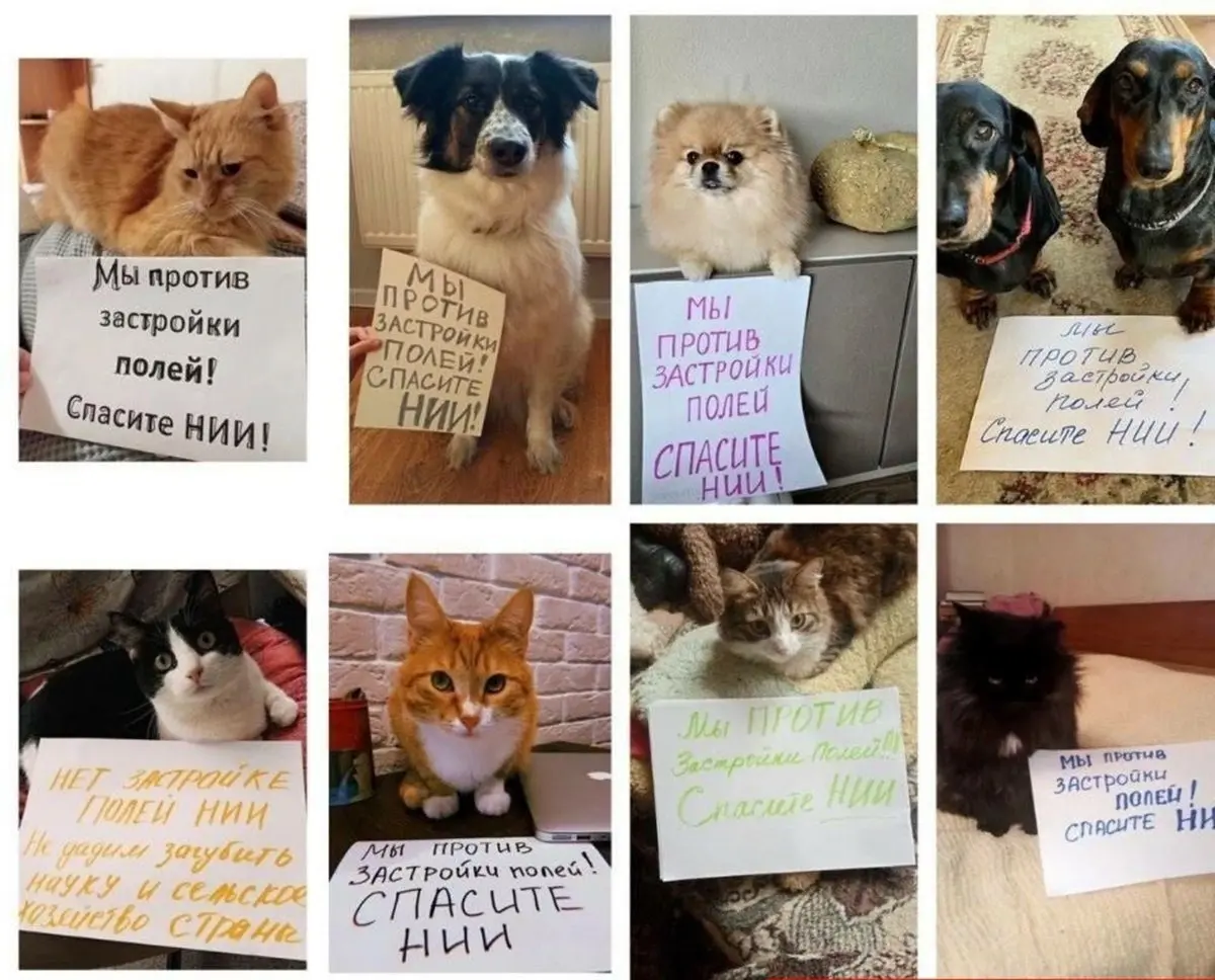 На фото домашние питомцы сидят рядом с плакатами, надпись на которой гласит: «Мы против застройки полей. Спасите НИИ!».