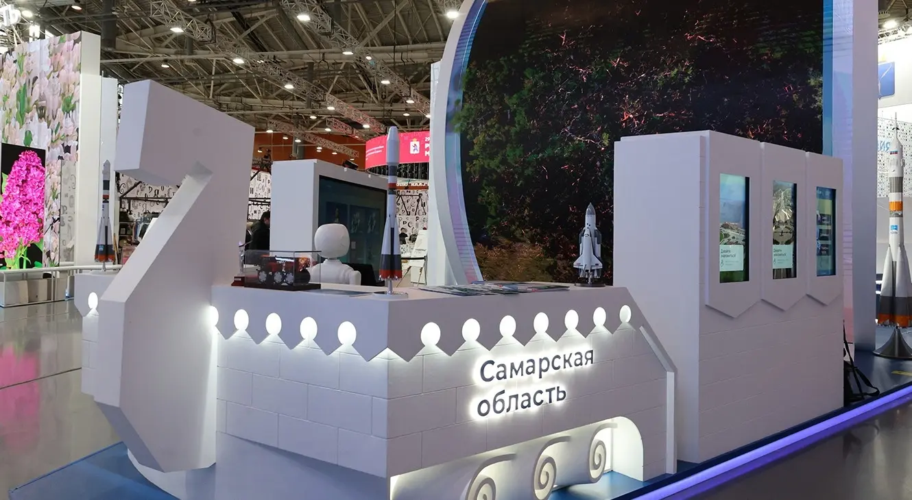 Регионы интегрируют в дизайн символы, фирменный стиль и ключевые смыслы: так, Самарская область на выставке «Россия» в 2023 году представила стенд в форме стелы «Ладья», моментально вызывая узнаваемые ассоциации с историей и географией территории.