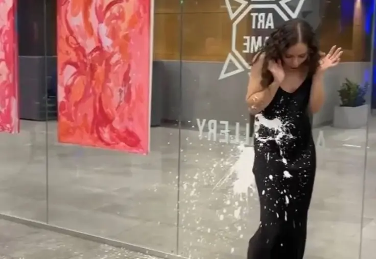После нескольких попыток вступить с гостьей в диалог и успокоить её, скандалистка выплеснула на художницу белую краску, которую пронесла с собой в бумажном стакане под видом кофе.