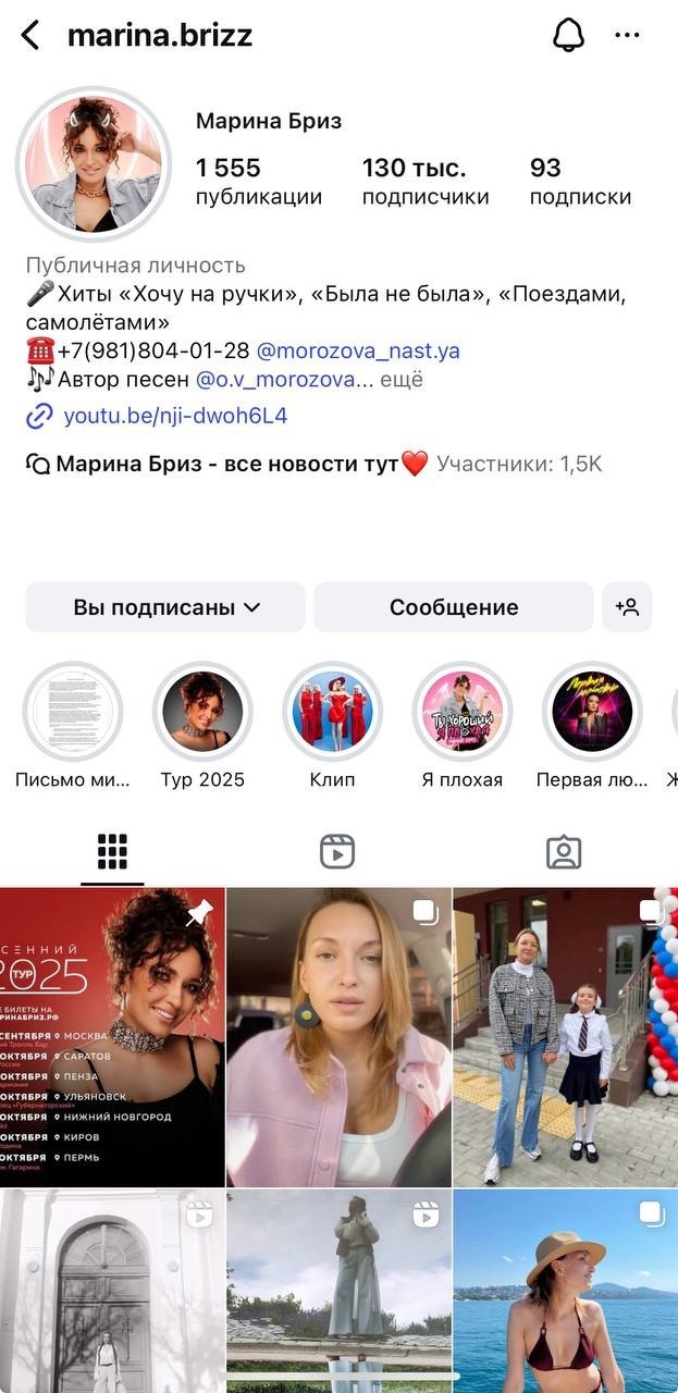 Марина Бриз — популярная российская певица, известная своими хитами «Хочу на ручки», «Была не была», «Поездами самолетами» и другими лиричными композициями, а также активной социальной позицией. Ее творчество фокусируется на темах любви, саморазвития и семейных ценностей.