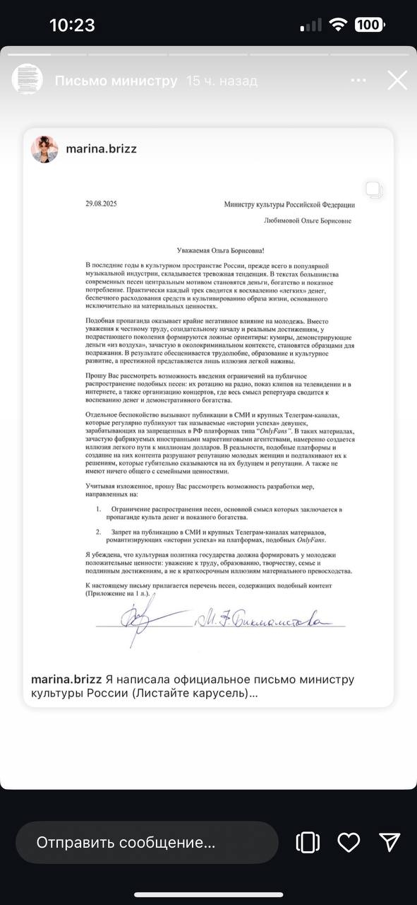 В письме Марина Бриз подчеркивает, что такие материалы оказывают разрушительное влияние на молодежь, формируя ложные ценности и обесценивая честный труд, образование и семейные идеалы.