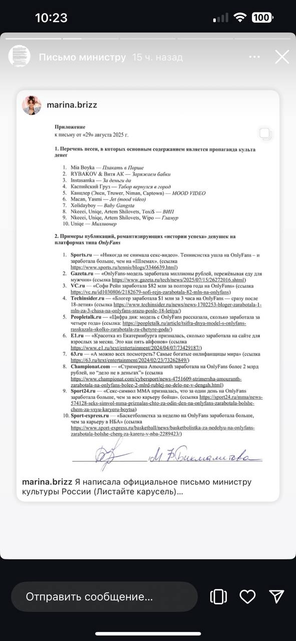 К письму прилагается перечень из 10 популярных песен, пропагандирующих культ денег (например, «Плакать в Порше» Mia Boyka, «За деньги да» Instasamka), а также 10 примеров публикаций в ведущих СМИ (таких как Sports.ru, Gazeta.ru, VC.ru), где описываются «успехи» на OnlyFans как легкий путь к миллионам.