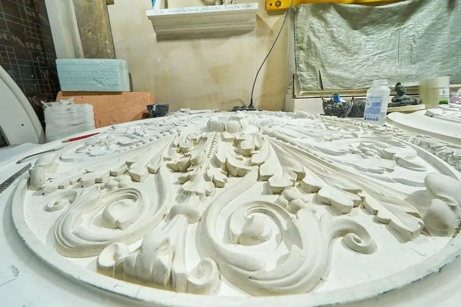 Для реставрации специалисты сначала очищают сохранившиеся лепные изделия, потом обследуют их на наличие трещин, следов прежнего ремонта и неправильных стыков.
