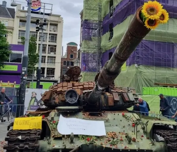 Советский танк Т-72 выставили в центре Амстердама как военный трофей, чтобы «поговорить о демократии». Однако эффект оказался неожиданным: голландцы украшают его цветами, делают снимки рядом с техникой.