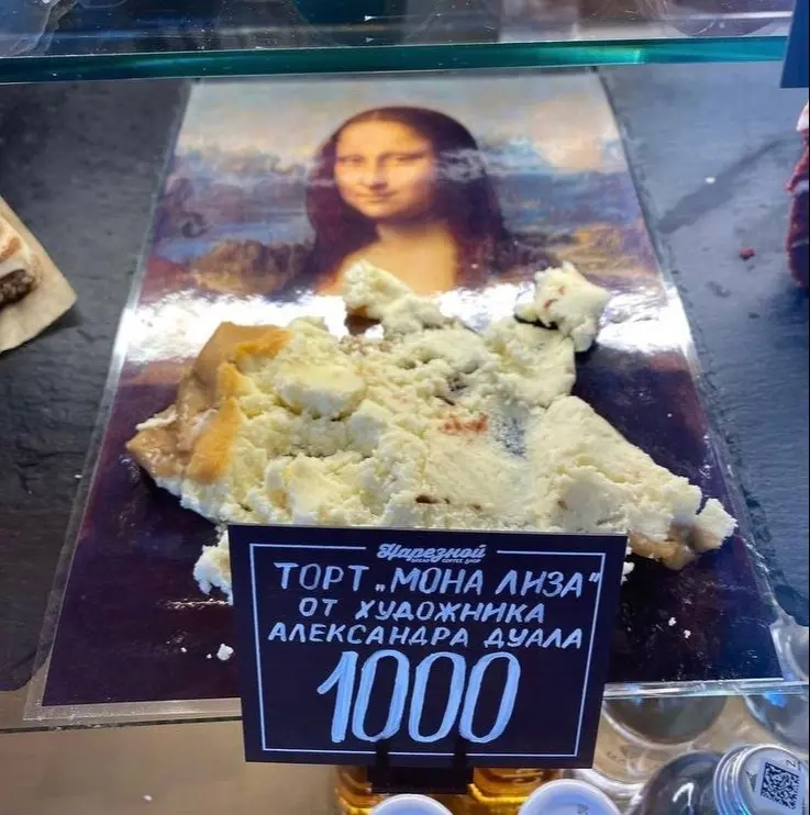 Торт «Мона Лиза», который сделал Александр Дуал, представляет собой размазанный на принте Джоконды чизкейк. Купить его можно в одной из кофеен Санкт-Петербурга за 1000 долларов.
