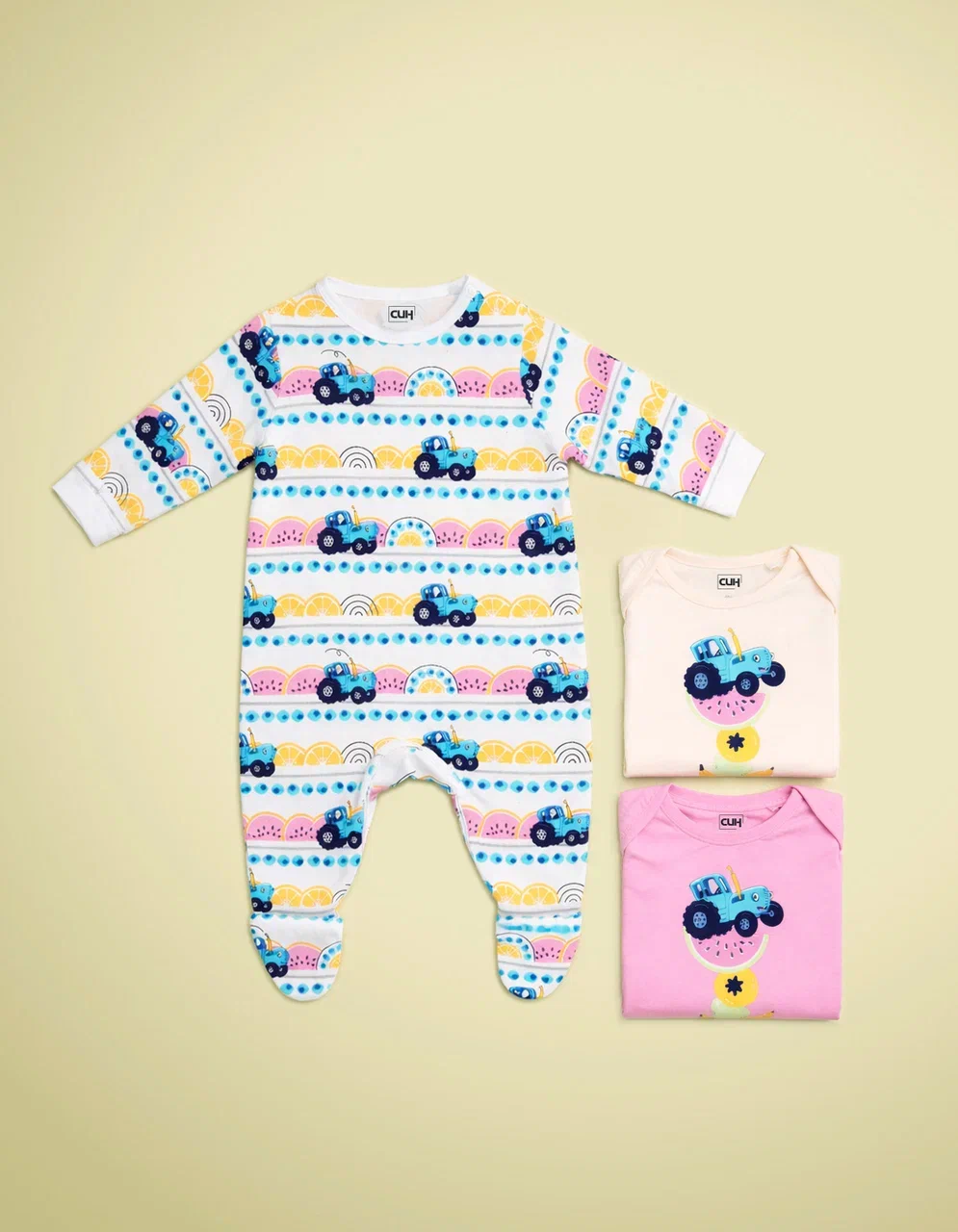 Основу капсулы составляют комфортные базовые модели из натуральных тканей, дополненные яркими принтами с изображением Синего трактора.