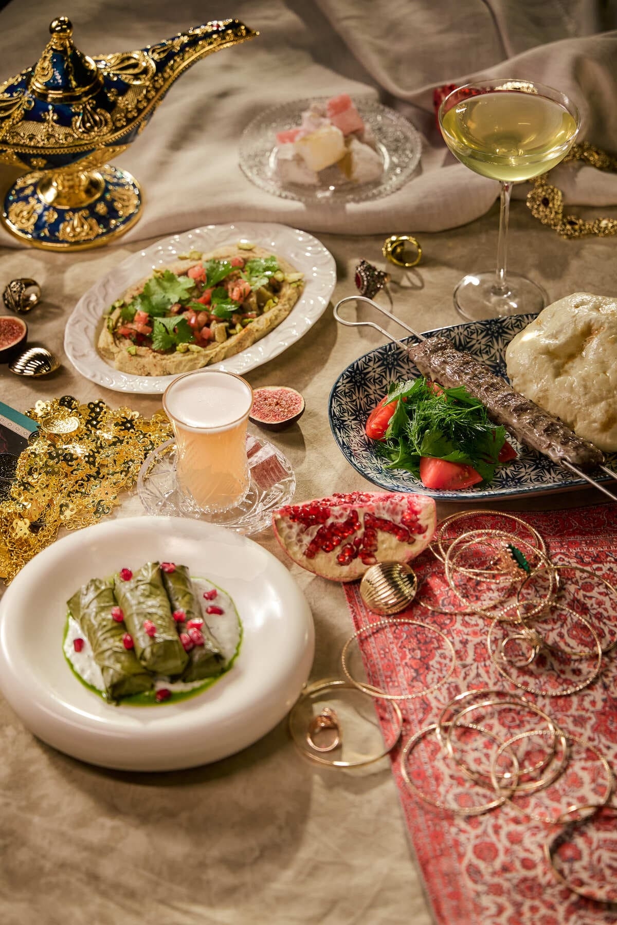 Меню, созданное в духе восточных сказок, включает долму с гранатом и соусом мацони, люля-кебаб с узбекскими томатами и хумус с печёным баклажаном и фисташковой пастой. Бармен Антон Герасимов дополнил сет авторскими коктейлями — «Лампой Аладдина» на джине с жасмином и «Восточным» с ромом и маракуйей.