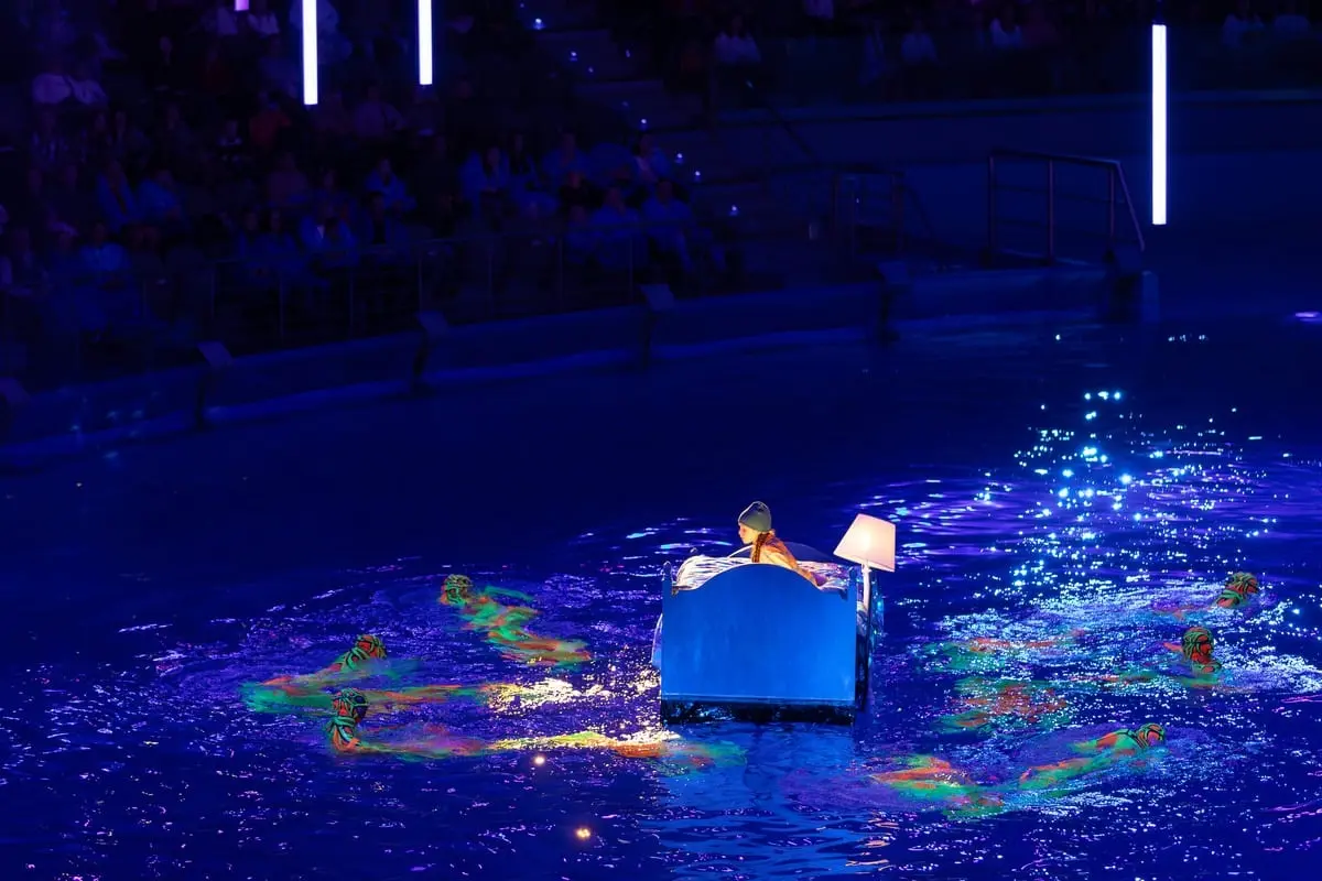 Зрителей ждут сотни ярких костюмов, захватывающие спецэффекты: 3D-проекции, лазеры и кинетический свет, а декорации мгновенно превращают привычное пространство в подводное чудо с неоновыми медузами и зеркальными дельфинами.