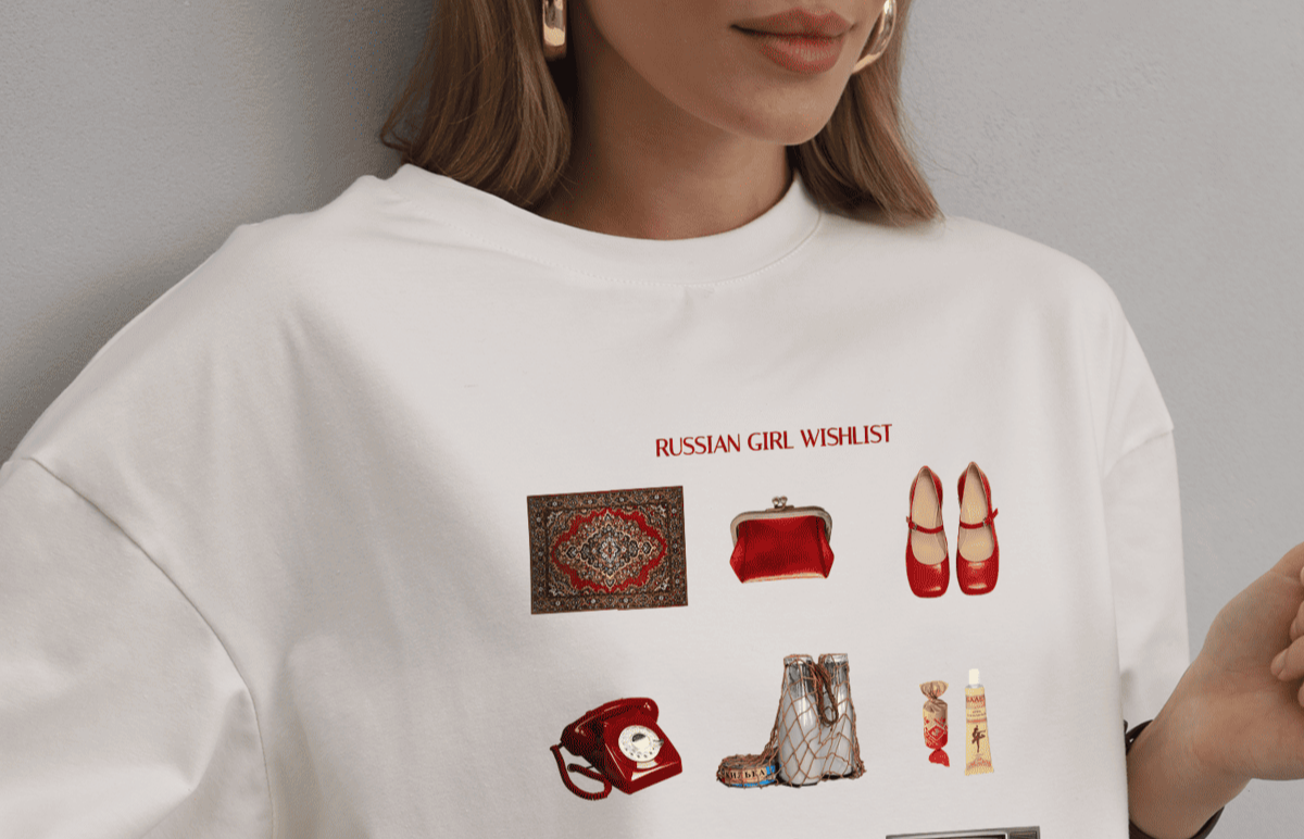 Центральный элемент — футболка Russian Girl Wishlist, созданная под впечатлением от киноплёнки, соцреализма и «ламповой» ностальгии.
