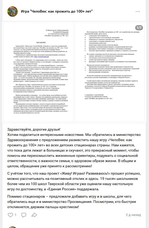 Тверской разработчик развивающей настольной игры «ЧелоВек: как прожить до 100+ лет» Сергей Штейн предложил внедрить игру в детские стационары по всей стране, направив обращение в Министерство здравоохранения Российской Федерации. Об инициативе стало известно из официальной группы проекта во «ВКонтакте».