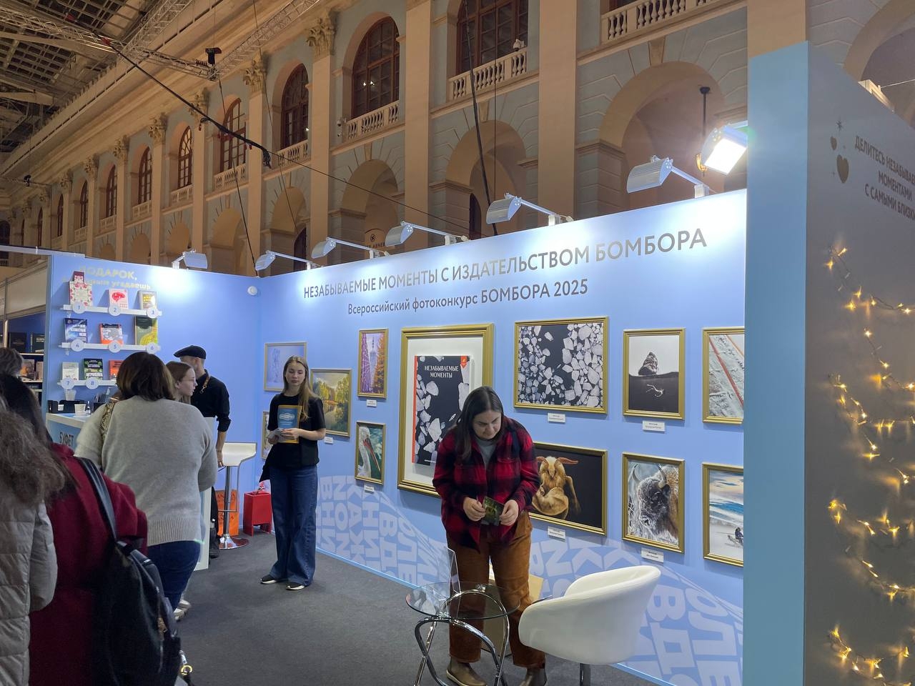 Стенд издательства БОМБОРА уже открыт и привлекает внимание благодаря оформлению в виде галереи, где книги представлены как художественные экспонаты.