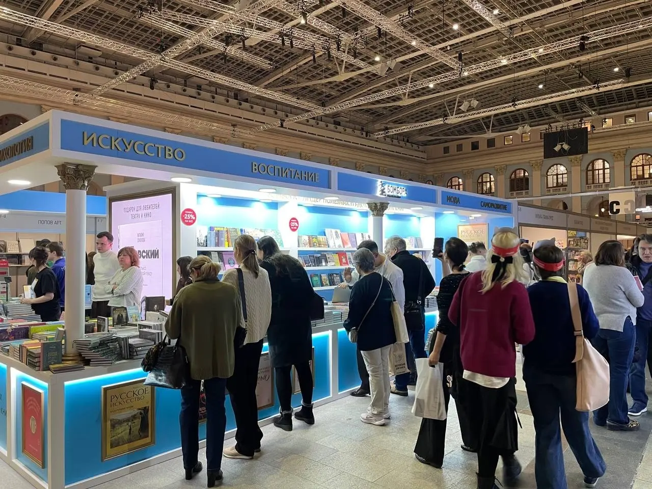 На стенде действует праздничная программа: работает кофейня, предлагаются напитки, а при покупке нескольких книг посетители получают подарки — календарь, фирменный шоппер и другие сувениры. На весь ассортимент распространяется скидка 25%.