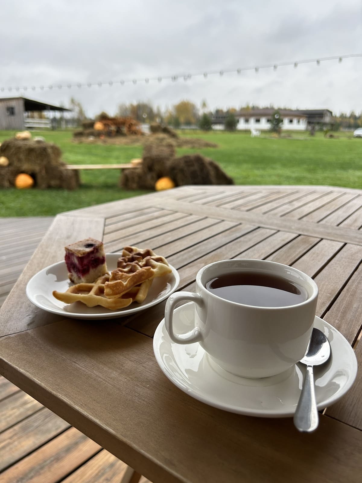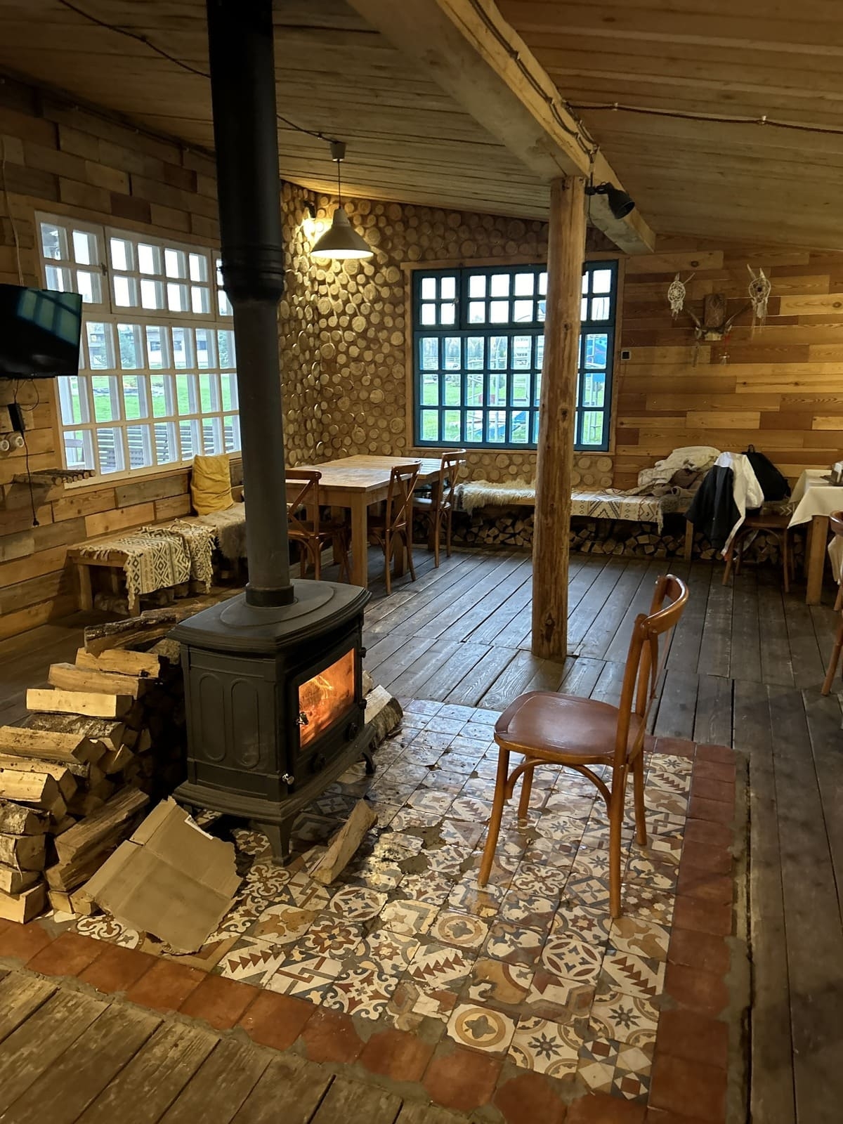 К ресторану прилегает веранда с видом на лес, и еще одна двухэтажная летняя веранда с видом на ранчо. На улице у окон стоят столы и стулья, где можно выпить чай, укутавшись в плед и дополнительно согреться от котов, коих на ранчо немало - у мышей здесь никаких шансов на выживание.