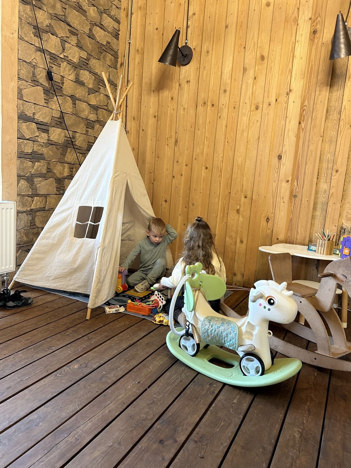 В ресторане для малышей есть отдельная зона с книжками, игрушками, лошадкой-качалкой и милым вигвамом. А еще летом любители йоги могут скрыться у реки на специальной площадке и заниматься вдоволь на свежем воздухе.