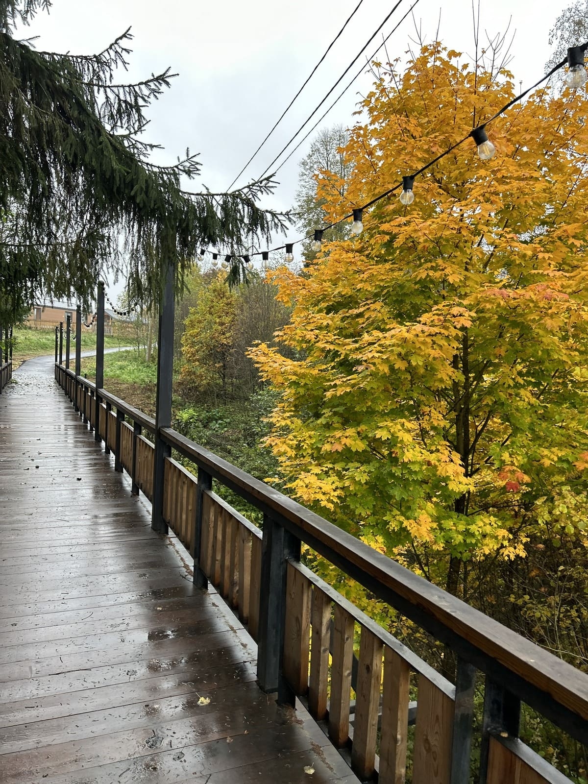 Если от ресторана пройти к лесу, а потом идти через него тропинкой, которая украшена фонариками и ленточками на деревьях, то можно выйти к бане у реки.