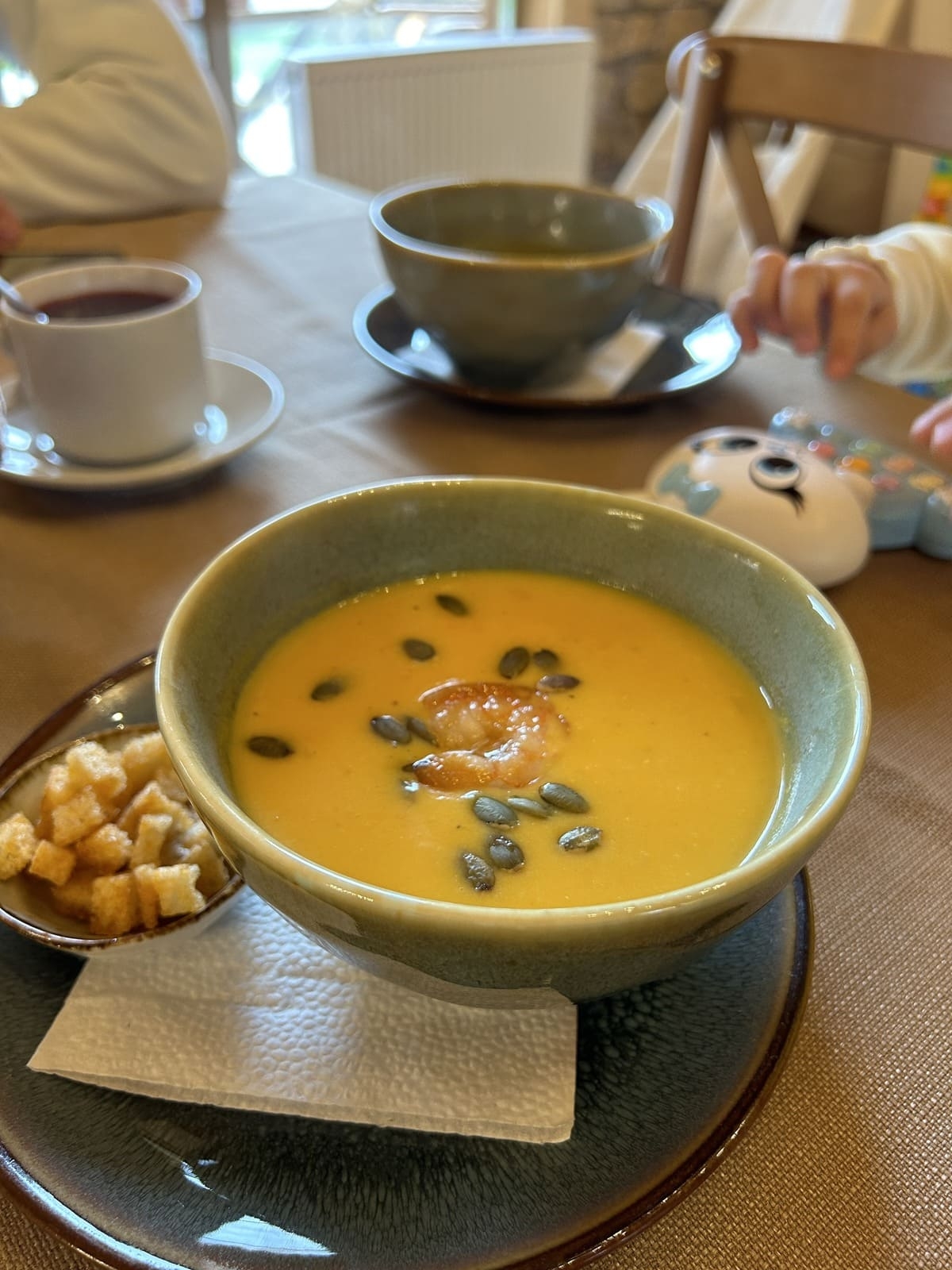 В ресторане – кухня сезонная и осенью к обеду, например, вам подадут вкуснейший тыквенный суп с креветкой, а на завтрак – все свое, фермерское, – творог со сметаной, сырники с вареньем или яичницу с домашним мясным рулетом.