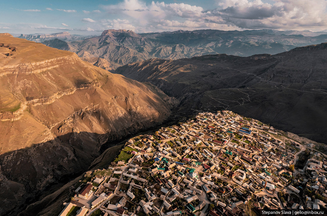 Хунзах расположен на высоте около 2000 метров. Дома здесь стоят прямо на краю плато, а под ними — стометровая пропасть. Некоторые балконы буквально нависают над ущельем.