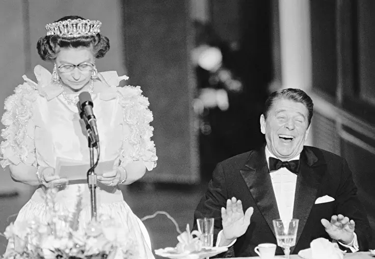 Президент США Рейган смеется после шутки королевы Елизаветы II, которая прокомментировала паршивую погоду в Калифорнии, которую она пережила с момента своего прибытия в Штаты. Британская королева выступает с кратким обращением во время государственного ужина, состоявшегося в музее Де Янга в Сан-Франциско.