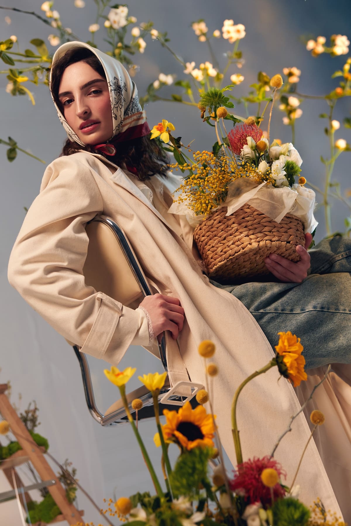 Гамма движется от прохладных тонов к тёплым, а аксессуары, шелковые платки и крупные серьги под золото, создают лёгкий акцент.
