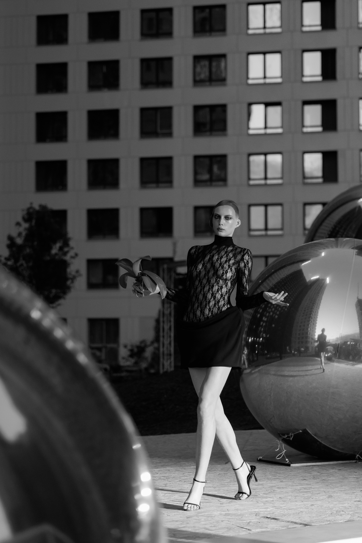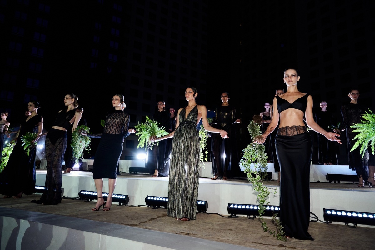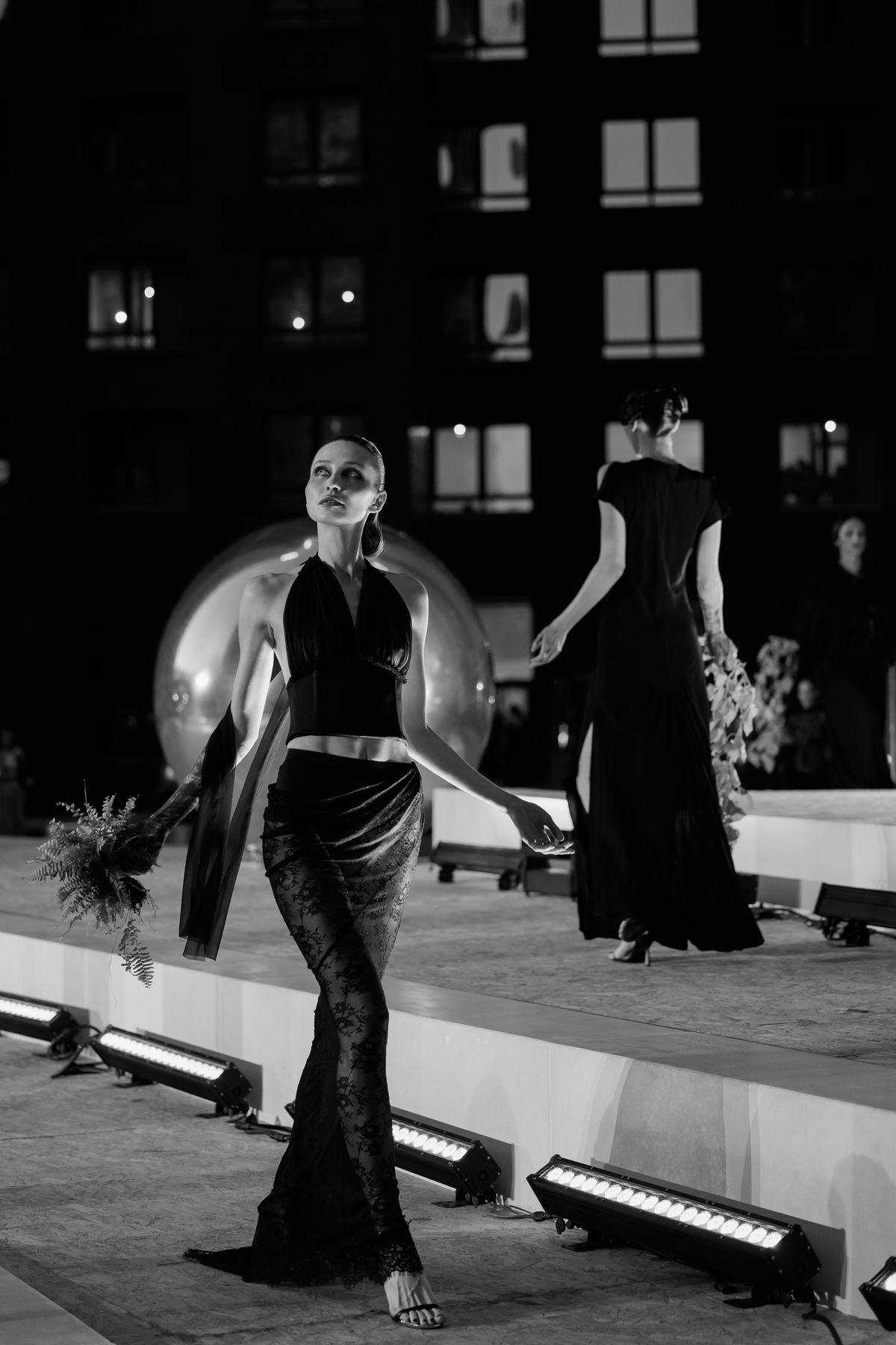 Новое пространство ЖК с его четкими линиями превратилось в декорации футуристического перформанса. В центре урбанистического ландшафта был создан искусственный оазис — возвышение, окруженное каменными блоками и зеркальными объектами. Контраст технологичности и рукотворной природы стал ключевой метафорой показа.