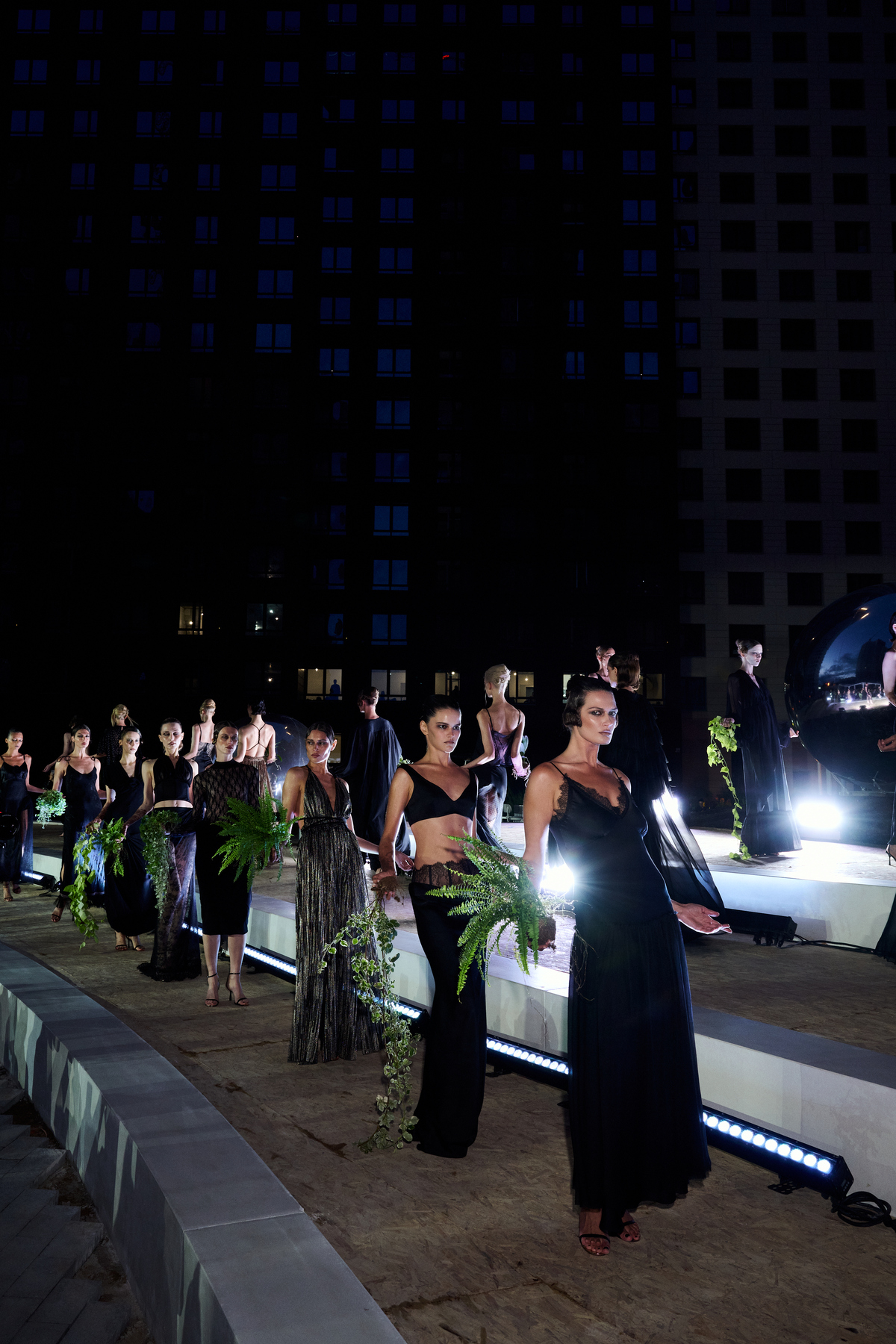 Финальная сцена на вершине холма превращала моделей в мираж — символ человека будущего, уже присутствующего, но еще неосязаемого. В завершение показа модели исчезли, оставив после себя лишь зеркальные артефакты и затихающие звуки, которые плавно перетекли в DJ-сет неформальной части.