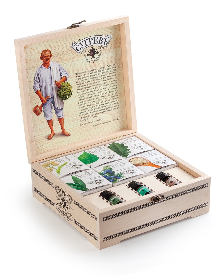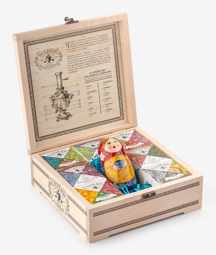 Стоит обратить внимание на коллекции чаев в деревянной шкатулке. Например, с 6 видами чая для бани и маслами: напитки можно употреблять как перед парной, так и после банных процедур. Еще один интересный набор — 7 эксклюзивных чайных купажей и матрешка ручной работы, внутри которой вы найдете варенье из малины.