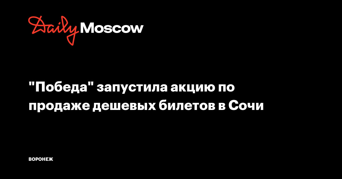 Акция "Победы" началась сегодня, 16 мая, в 11:00. С сегодняшнего дня по 20 мая жители Воронежа могут приобрести билеты в Сочи по низким ценам. Пресс-служба акцентирует внимание на том, что предложение распространяется только на рейсы в одну стороны с вылетом в период с 23 мая по 30 июня 2016 года: