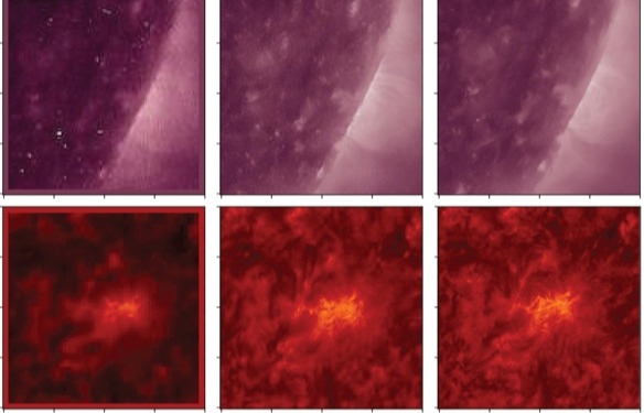 Пример иллюстрирует снимки от спутника SOHO/EIT, их аналоги, улучшенные методом ITI, и эталонные изображения с SDO/AIA. Три ряда демонстрируют наблюдения солнечного лимба в экстремальном ультрафиолете, активной области и магнитного поля солнечного пятна.